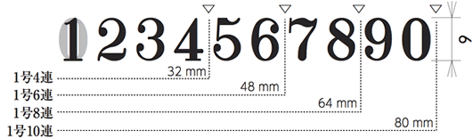 | ※ | 文字の配列は、文字の大きさにより異なります。上記の配列は、5号、4号、3号を基準としております。 |