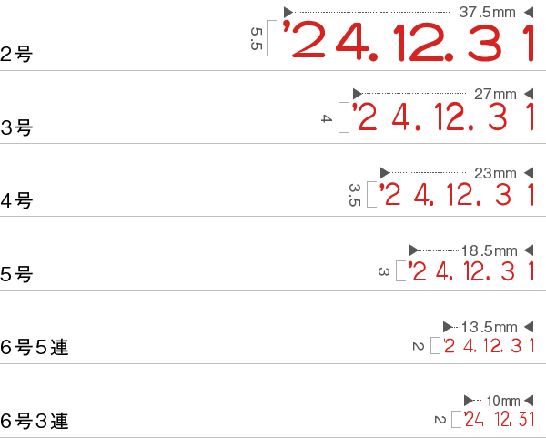 2号から6号まで幅広いサイズの基本的な日付印がそろっています。 ※6号3連の年号は、元号・略西暦表示となります。 2号 2,860 ご注文へ 3号 1,881 ご注文へ 4号 1,760 ご注文へ 5号 1,518 ご注文へ 6号(5連) 1,518 ご注文へ 6号(3連) 1,815 ご注文へ